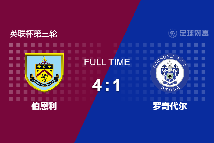 最终,伯恩利4-1轻松淘汰罗奇代尔,晋级到下一轮。