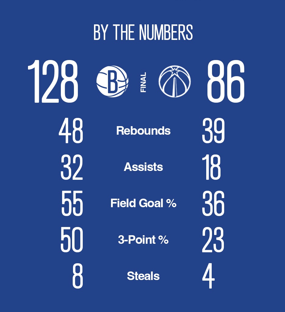 本场比赛,杜兰特砍下28+9+11的准三双,出战33分钟三节打卡下班,率队128-86大胜奇才42分,取得本赛季最大分差的一场胜利,同时追平了队史客场最大赢球分差,奇才创造队史主场输球分差纪录。日本国手渡边雄太出场24分钟,得到14分8篮板,奇才阵中的日本球员八村塁得到2分2篮板。
