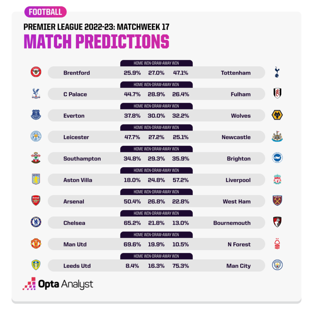 Opta Analyst 预测英超第17轮10场比赛主队客队取胜概率及平局概率。