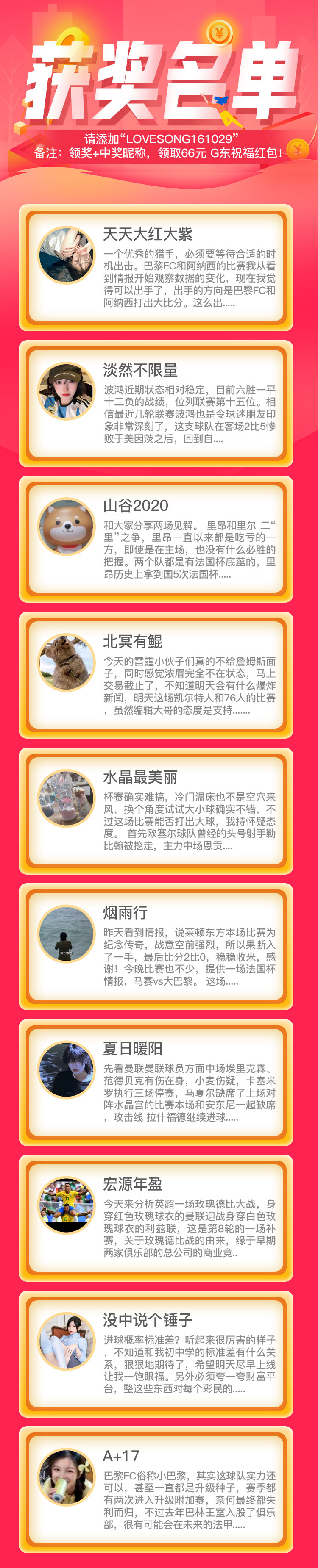 每日由团队内的资深编辑精选出指定比赛赛果的正确答题,根据“进球概率”及自己对比赛的理解在评论区表达观点,我们依旧会挑选出优质留言并进行现金奖励。