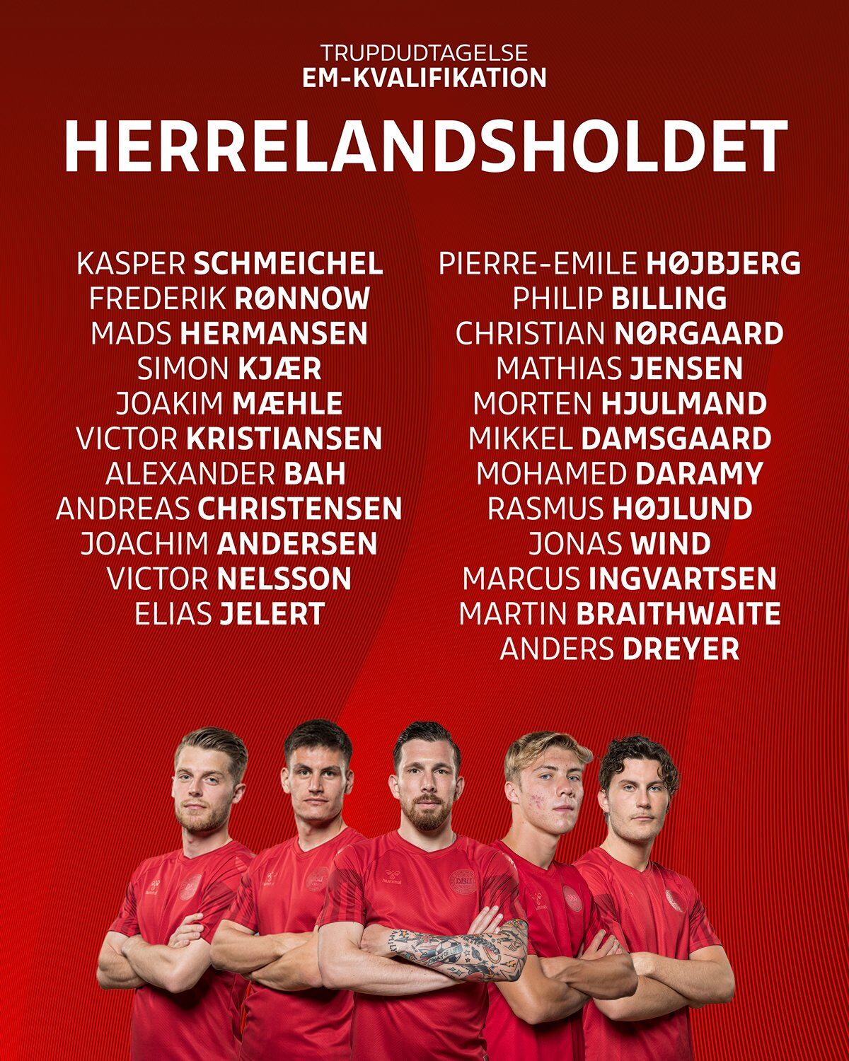 后卫:克亚尔(AC米兰)、迈赫勒(亚特兰大)、维克多-克里斯滕森(莱斯特城)、巴赫(本菲卡)、安德烈亚斯-克里斯滕森(巴萨)、尼尔森(加拉塔萨雷)、耶勒特(哥本哈根)、安德森(水晶宫)