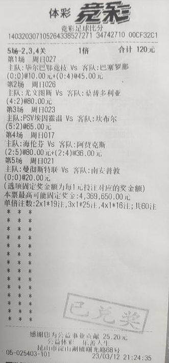 3月12日这天绝对是小秦的惊喜时刻,当晚他在赛前投注了一张竞彩足球比分自由过关游戏,共挑选了当天的5场赛事,选择2、3、4关。第一场为周日027毕尔巴鄂竞技VS巴萨,双选比分(0:0)、(0:4);第二场为周日026尤文图斯VS桑普多利亚,单选比分(4:2);第三场为周日023埃因霍温VS坎布尔,单选比分(5:2);第四场为周日017海伦芬VS阿贾克斯,双选(2:5)、(2:4);第五场为周日021曼联VS南安普顿,单选比分(0:0)。