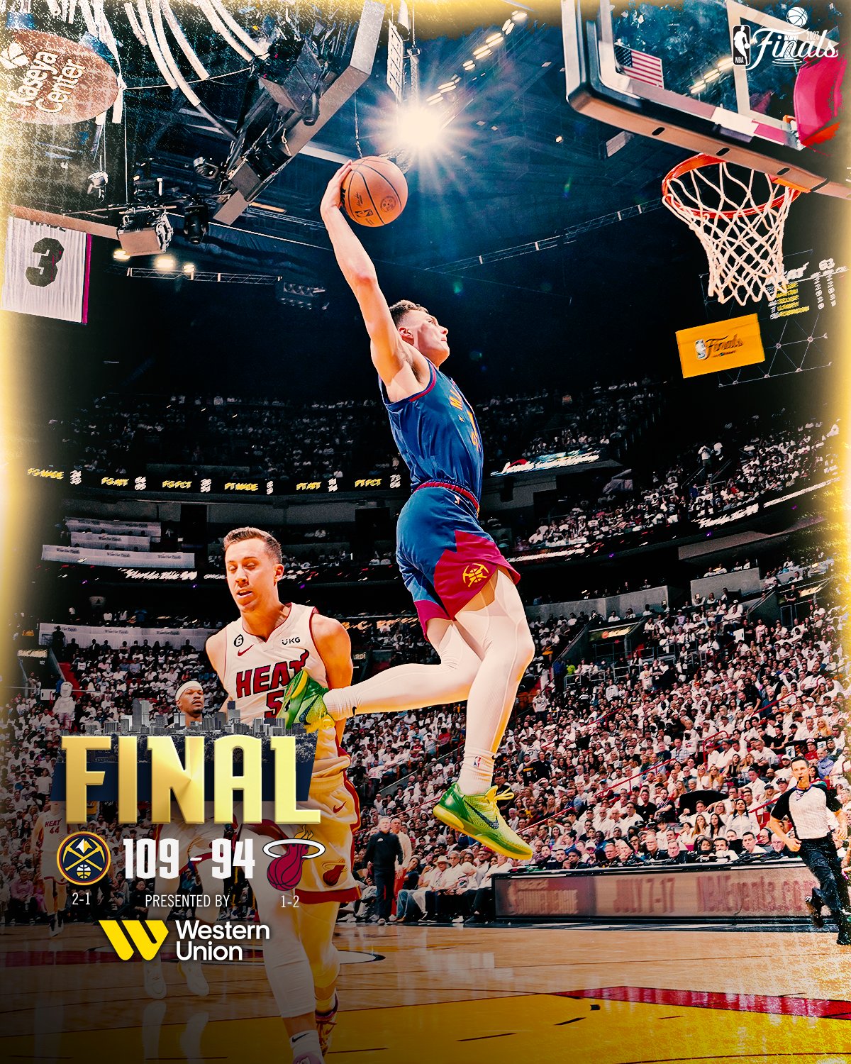 首节比赛中,约基奇、巴特勒分别得10分,双方24-24平,第二节约基奇神勇发挥14+12+7带队半场53-48领先热火,第三节比赛,热火手感不佳,被掘金打出6-0继续拉开比分,第4接比赛中,掘金打出11-4开局,领先优势一度扩大至21分,最终掘金客场109-94击败热火,总比分2-1再次领先。