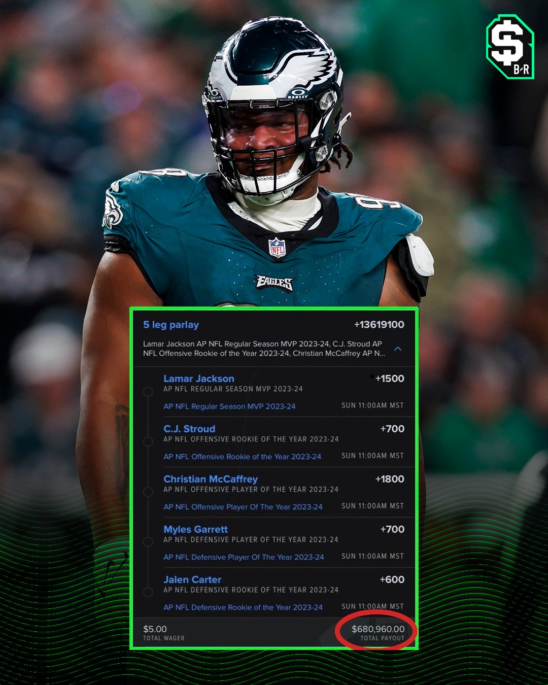 杰伦-卡特(费城老鹰队),将会获得23/24赛季NFL年度最佳防守新秀。
