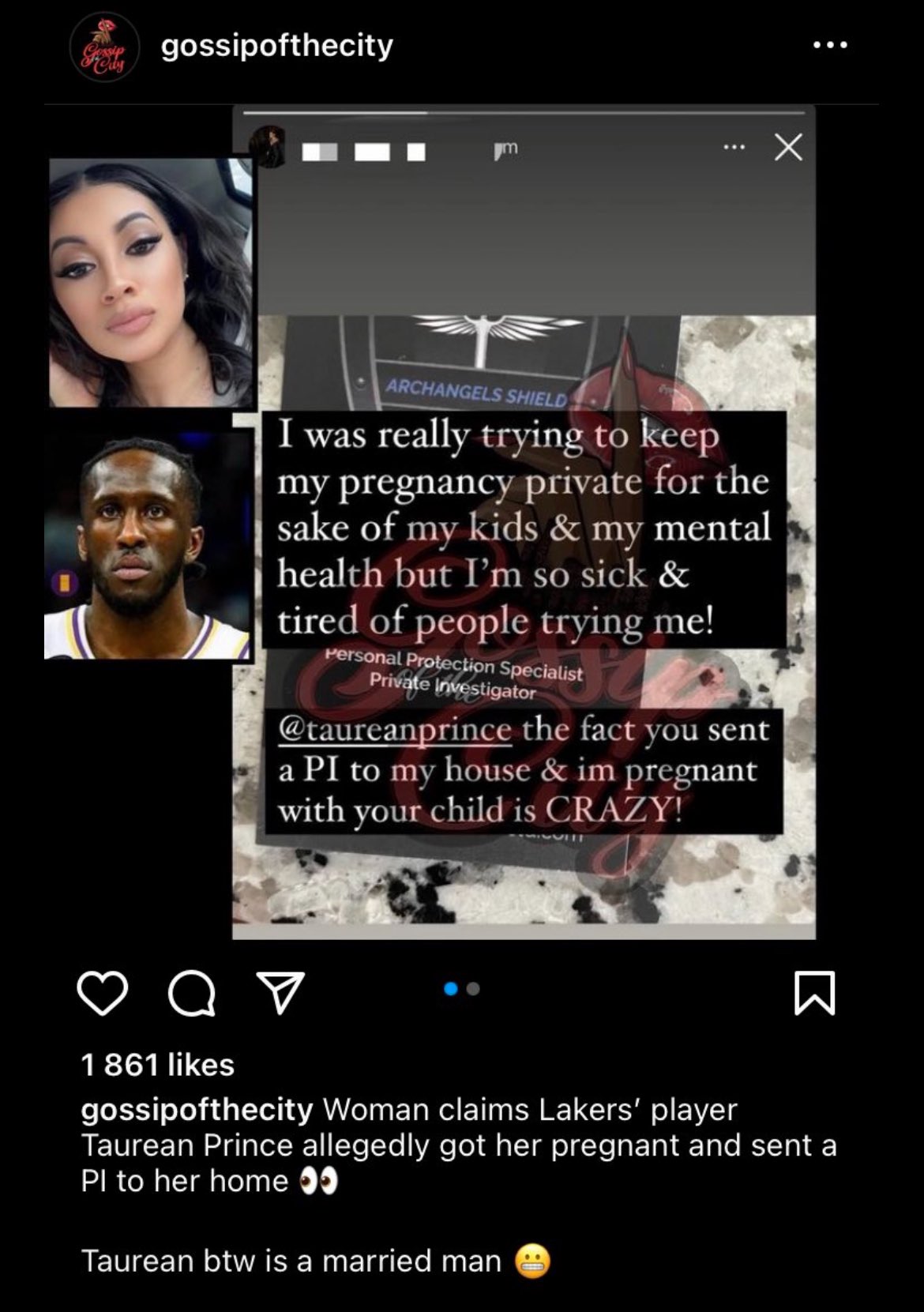 湖人球员是一名已婚人士,如果该女子怀孕是事实,那么普林斯就做事了婚内出轨传闻。
