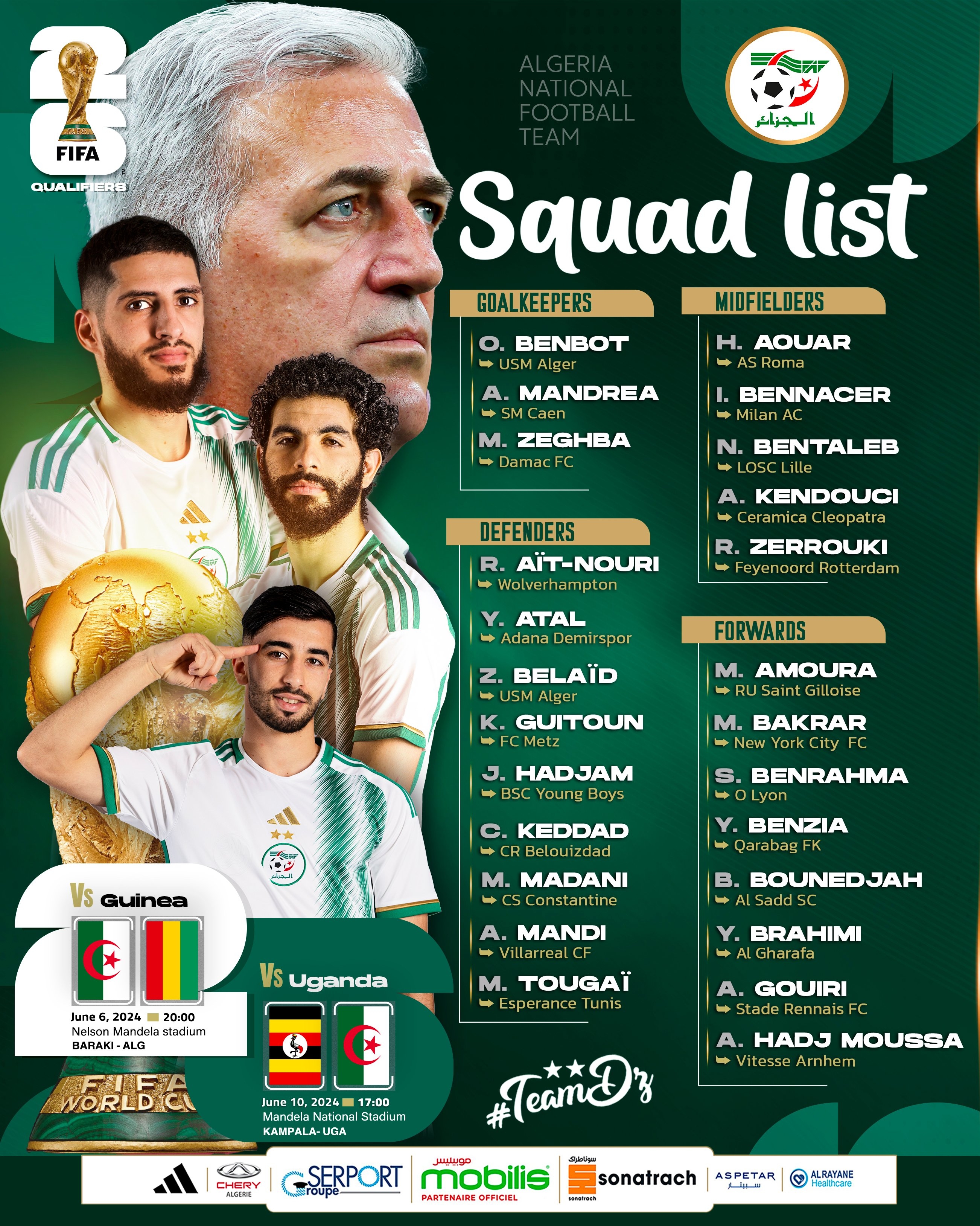 阿尔及利亚将在6月7日世预赛主场对阵几内亚,6月10日客场挑战乌干达。