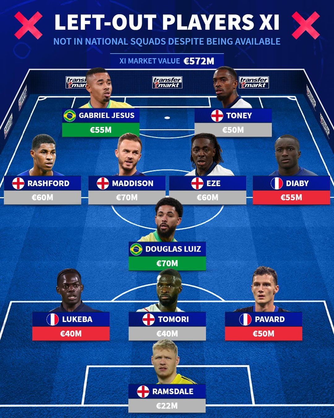 国际比赛日期间,德转盘点了落选国家队大名单的球星最贵阵,总身价达到5.72亿欧元,英格兰6人入选,法国3人入选,其中身价最高的是巴西中场道格拉斯·路易斯和热刺攻击手麦迪逊。拉什福德继续无缘英格兰代表队,参加了欧洲杯的埃泽和伊万·托尼没有得到征召。