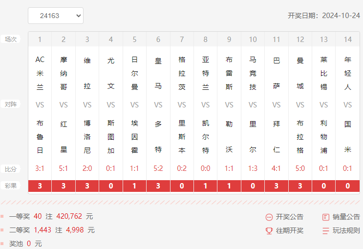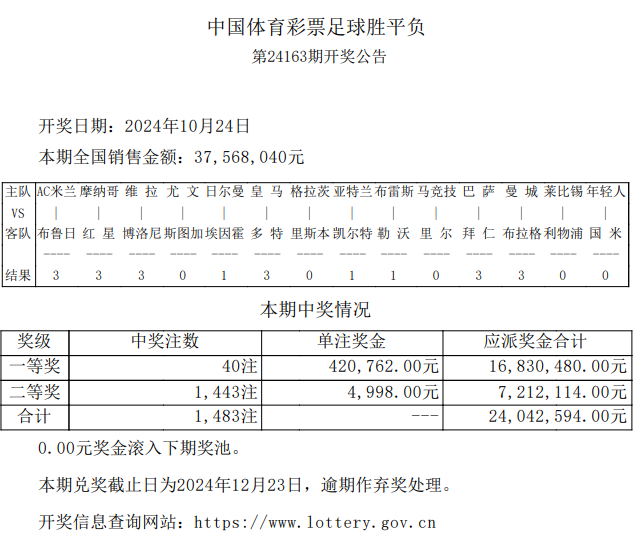 北京时间10月24日,胜负彩24163期开奖结果,本期一等奖40注420,762元,二等奖1,443注4,998元。任选9场7,654注1,497元。本期14场投注总额37,568,040元,本期任选9场投注总额17,906,850元。