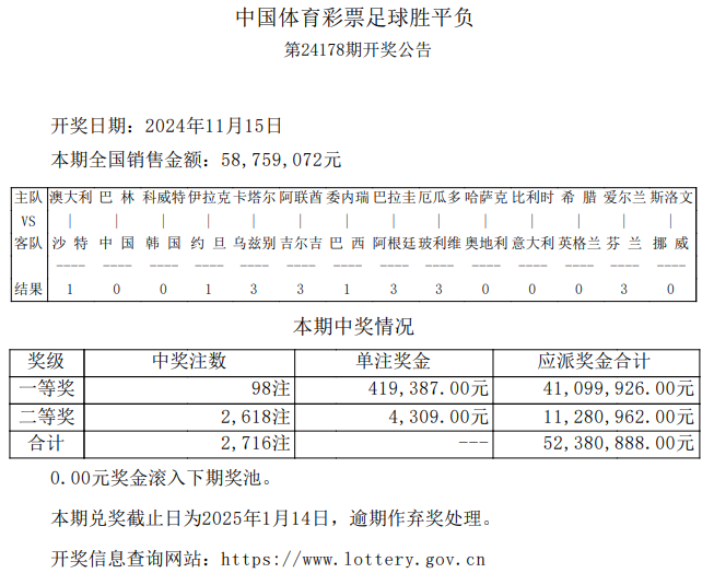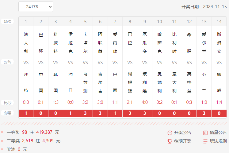 北京时间11月15日,胜负彩24178期开奖结果,一等奖98注419,387元,二等奖2,618注4,309元;本期任选9场8,378注1,693元。本期14场投注总额58,759,072元,本期任选9场投注总额22,162,666元。