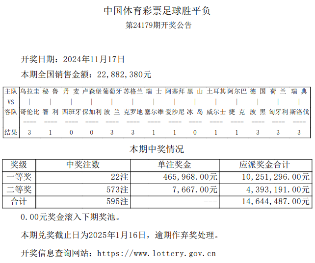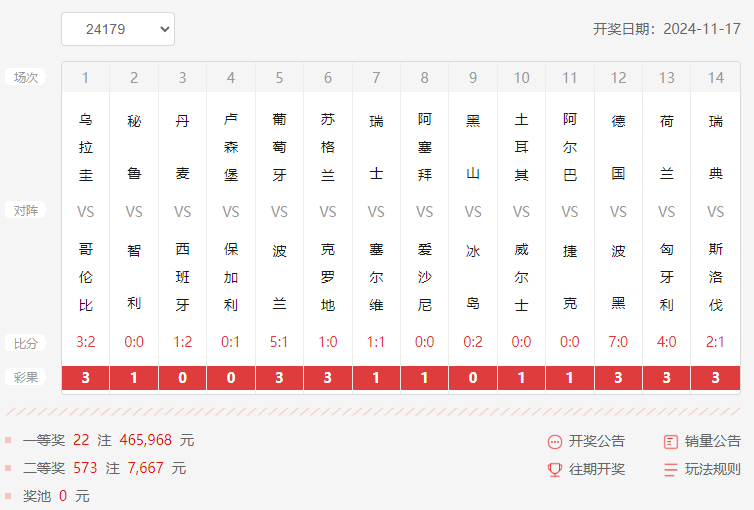 北京时间11月17日,胜负彩24178期开奖结果,本期一等奖22注465,968元,二等奖573注7,667元,本期任选9场9,552注1,268元。本期14场投注总额22,882,380元,本期任选9场投注总额18,928,328元。