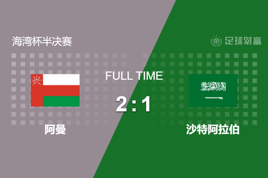 最终全场比赛结束,阿曼2-1击败沙特阿拉伯,成功杀入海湾杯决赛。