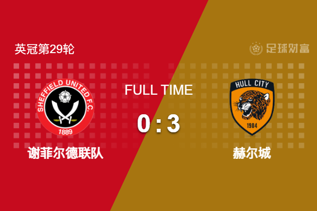 最终全场比赛结束,谢菲联主场0-3完败赫尔城。