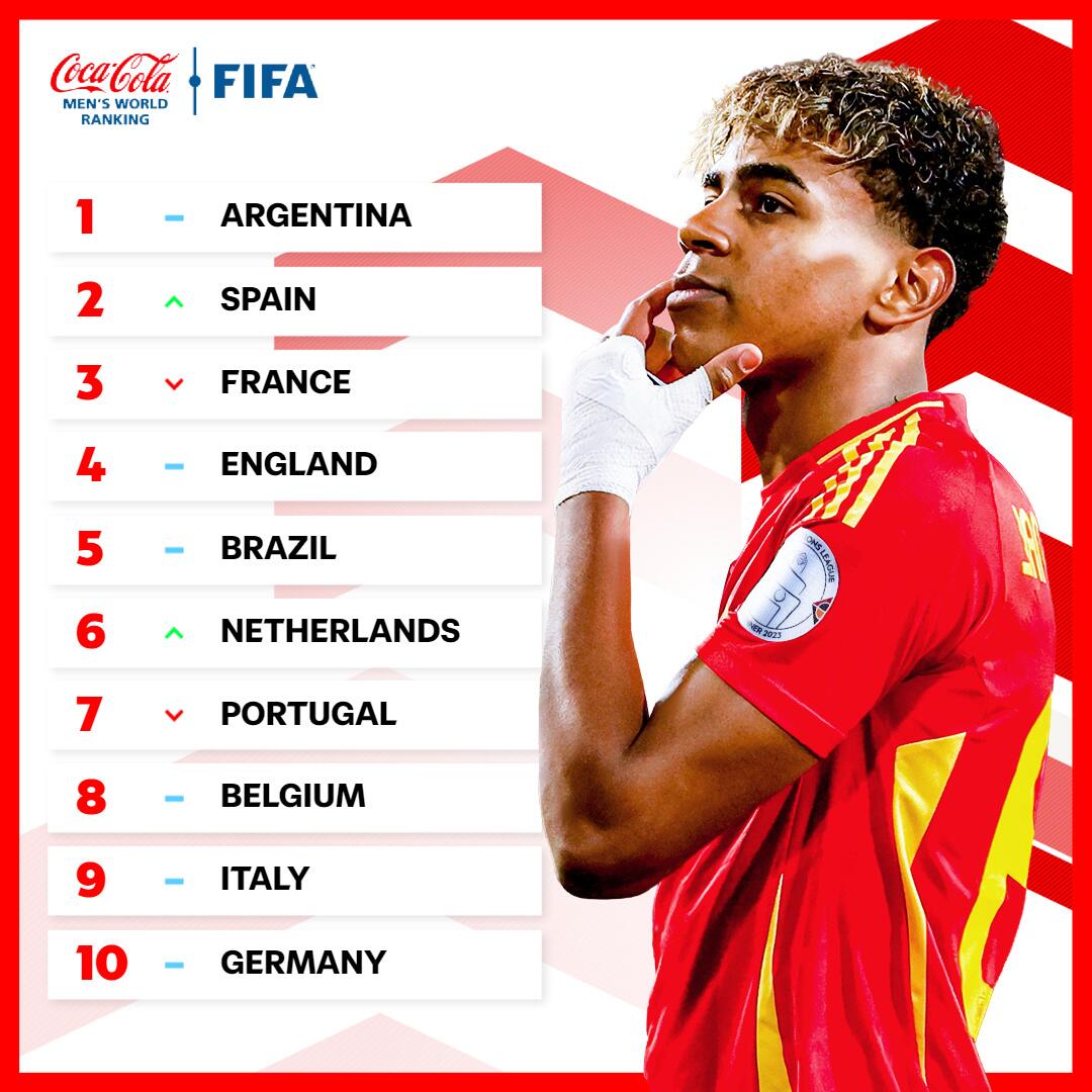 国际足联公布FIFA国家队最新一期排名,阿根廷居首,西班牙升至第2,法国第3,葡萄牙下降一位排在第7。国足目前则跌至世界第94位,亚洲第14位。