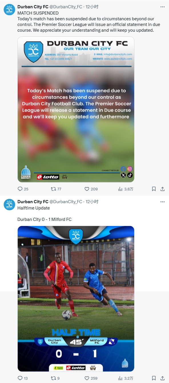 北京时间4月23日,南非甲级联赛第26轮的一场较量,德班城FC主场迎战米尔福德。比赛上半场结束时传来噩耗,原本将在本场比赛首发出战的22岁南非球员西纳曼德拉-宗迪不幸去世,比赛也因此腰斩。