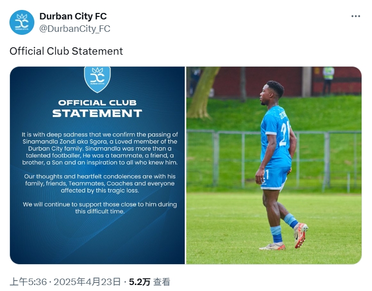 赛后,德班城FC发布官方公告写道:“我们怀着沉痛的心情宣布,德班城大家庭挚爱的成员西纳曼德拉-宗迪(Sinamandla Zondi)不幸离世。西纳曼德拉不仅是一位才华横溢的足球运动员,他还是我们的队友、朋友、兄弟、孩子,也是所有他身边的人的榜样。”
