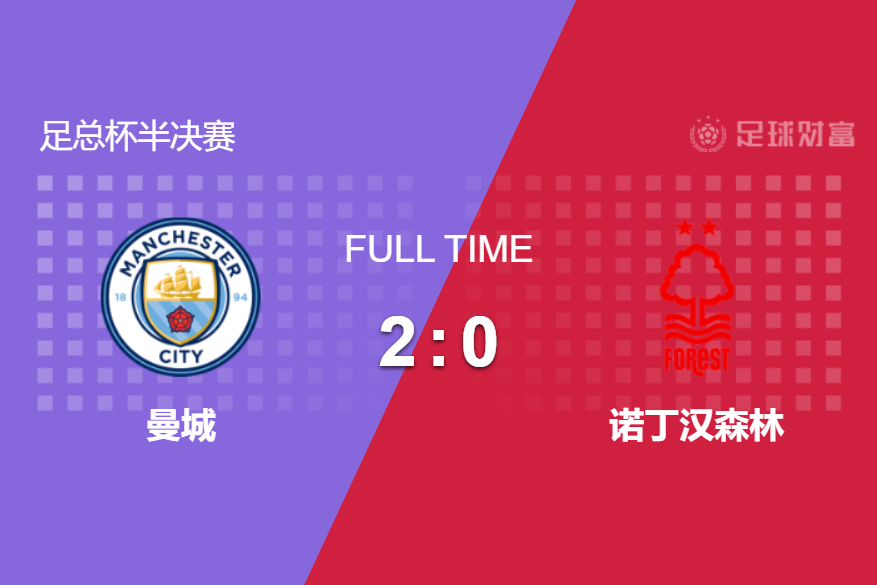 最终全场比赛结束,曼城2-0击败诺丁汉森林。