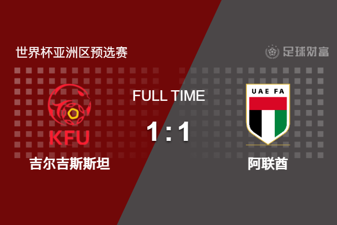 最终全场比赛结束,吉尔吉斯斯坦主场1-1绝平阿联酋。