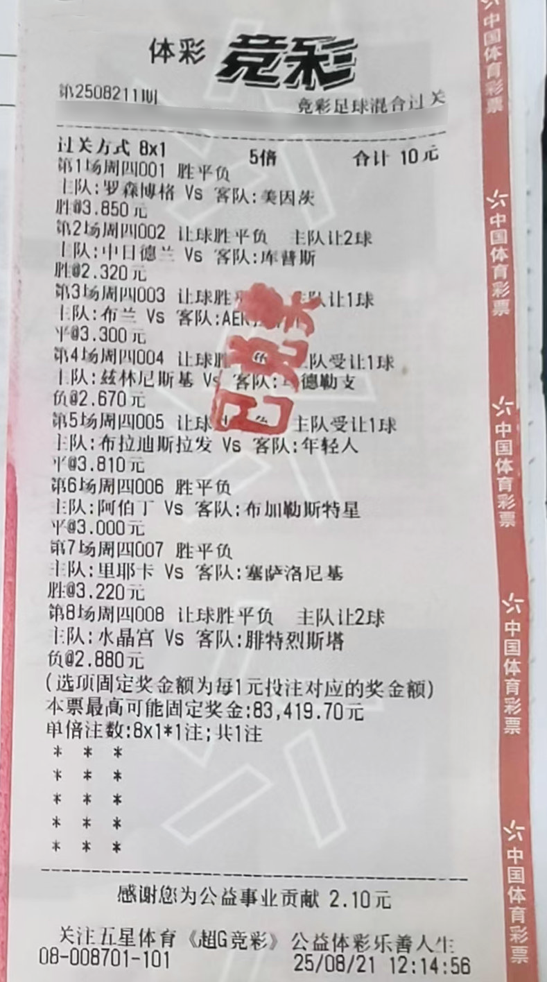 近日,彩民晒出了自己仅花费10元购买的5倍8串1竞足混合过关,最终得到奖金8.3万元。