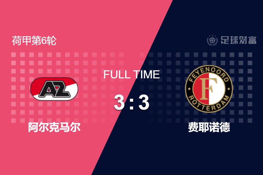 最终全场比赛结束,阿尔克马尔3-3战平费耶诺德。
