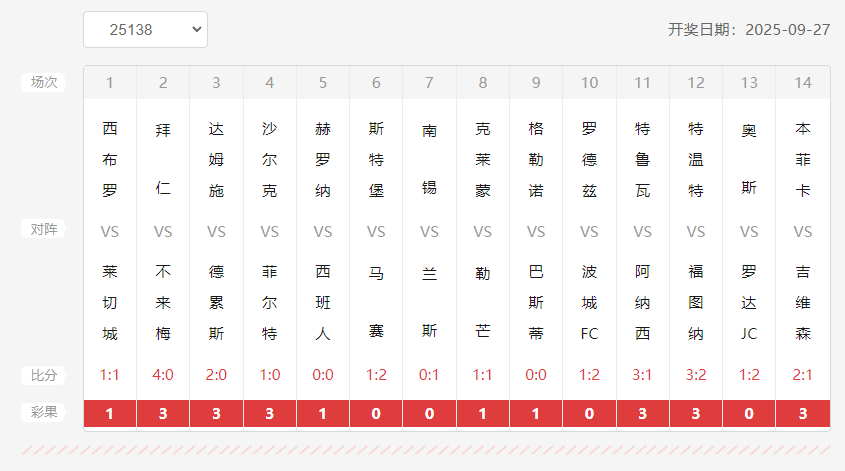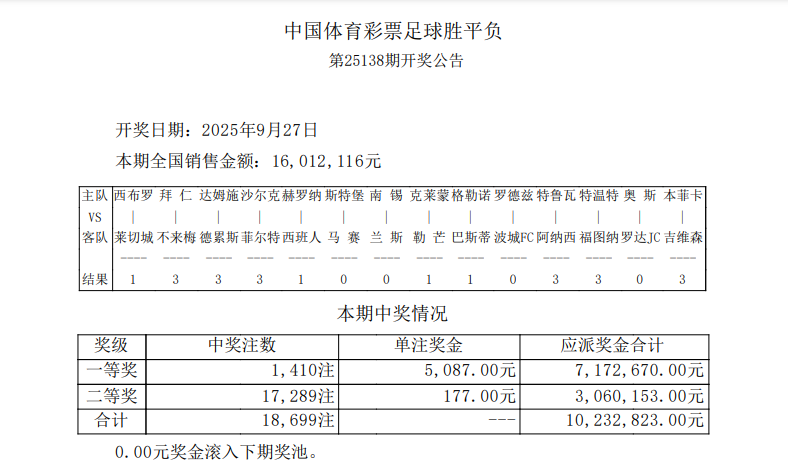 北京时间9月27日,胜负彩25138期开奖结果,本期一等奖1,410注5,087元,二等奖17,289注177元,0元滚入下期奖池;任选9场78,930注150元;本期胜负彩投注总额16,012,116元,本期任9投注总额18,503,722元。
