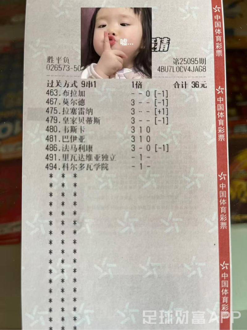 近日,APP用户朋友(每天稳单二场)分享出比分实单,花费36元购买9串1,最终全部精准命中,36元收获万元大奖,堪称平民神单。