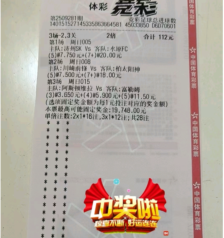 APP用户朋友(三叶草 521)分享出比分实单,花费112元购买3串过2,3关,最终精准命中进球数总和,成功获得了万元大奖。