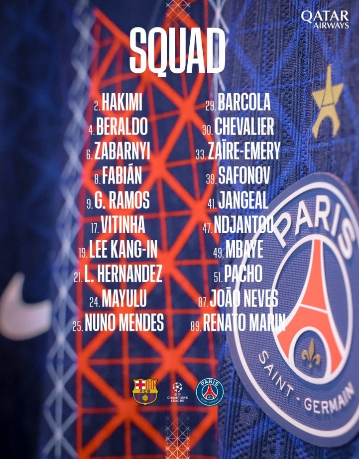 巴黎公布对阵巴萨名单:内维斯领衔,K77、登贝莱缺席