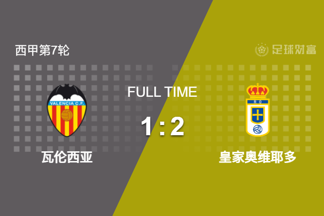 最终全场比赛结束,皇家奥维耶多客场2-1逆转瓦伦西亚。