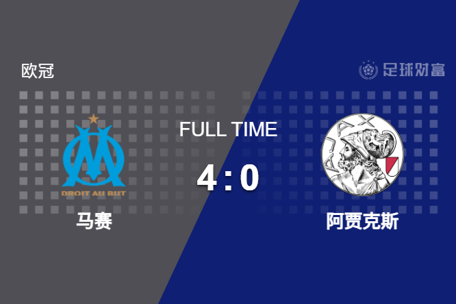 最终全场比赛结束,马赛主场4-0完胜阿贾克斯。