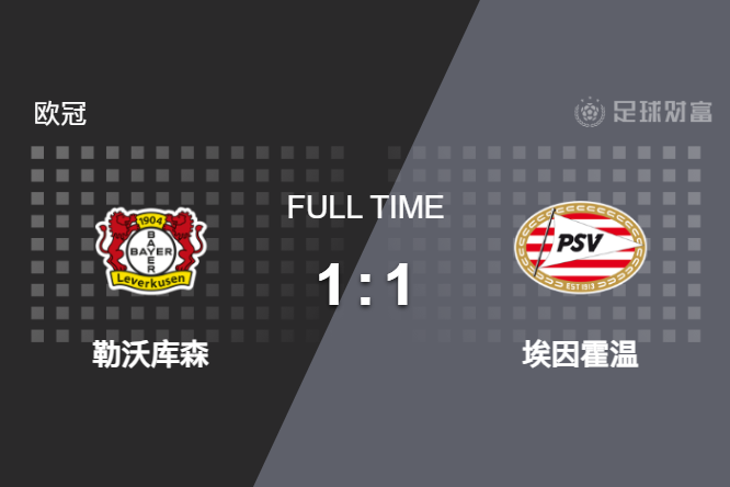 最终全场比赛结束,勒沃库森主场1-1战平埃因霍温。