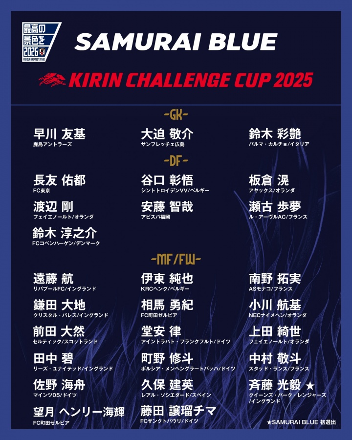 迎战巴西!日本国家队名单:久保健英领衔,远藤航入选