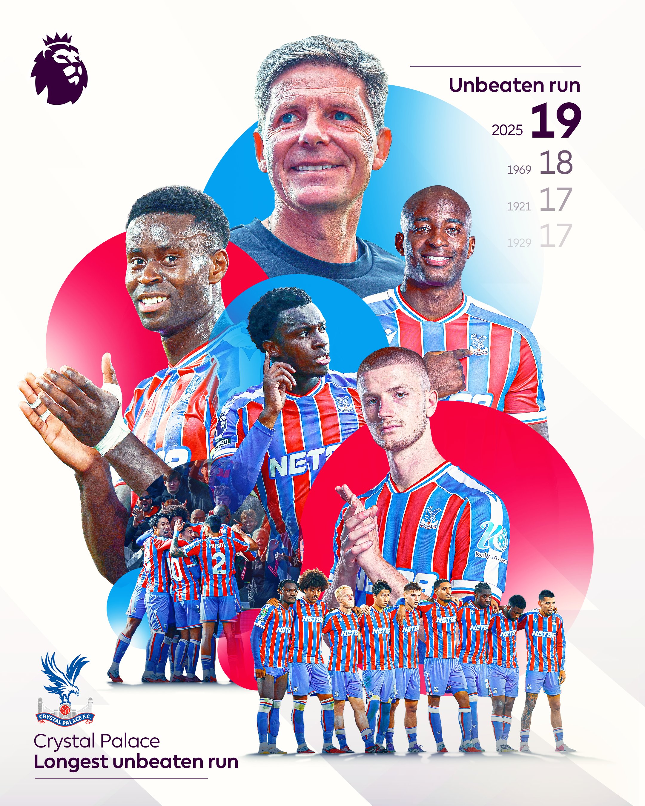 赛后相关数据统计,自2025年4月17日,上赛季英超联赛第29轮在客场0-5惨败纽卡以来,水晶宫至今各项赛事连续19场正式比赛保持不败,具体战绩为9胜10平,这创造了队史最长连续不败纪录,此前球队纪录是在1969年连续18场正式比赛不败。