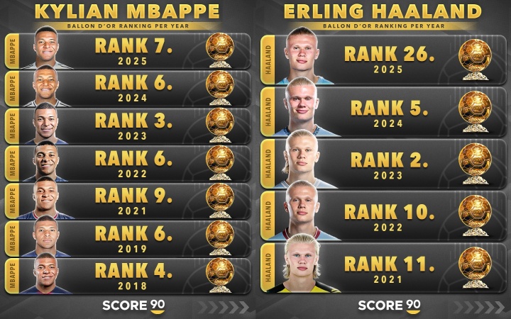 姆巴佩vs哈兰德历年金球奖排名: