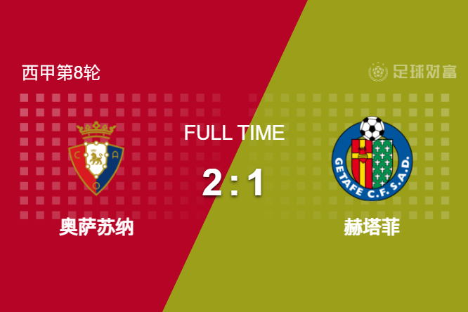 最终全场比赛结束,奥萨苏纳主场2-1战胜赫塔菲,取得近4轮联赛首胜。
