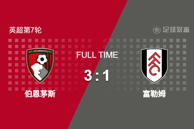 最终全场比赛结束,伯恩茅斯主场3-1逆转富勒姆暂升积分榜第二。