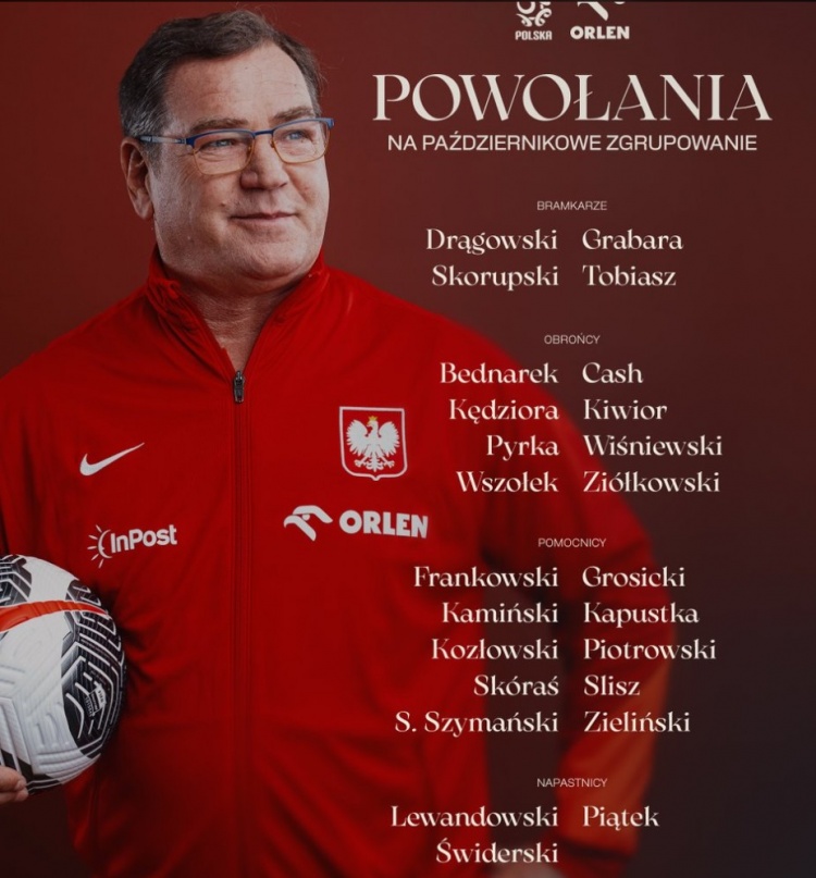 波兰足协在官方社媒公布了出征世预赛的国家队球员名单,当家球星莱万领衔,中场泽林斯基、后卫基维奥尔等人在列。