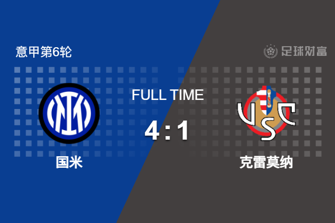 最终全场比赛结束,国米主场4-1大胜克雷莫内塞。