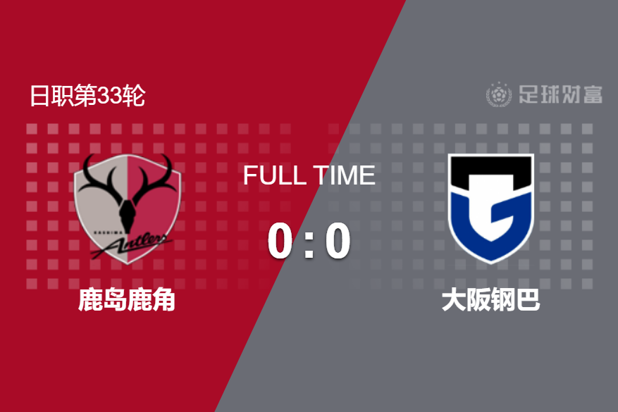 最终全场比赛结束,鹿岛鹿角0-0战平大阪钢巴。