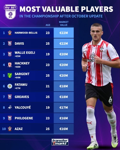 值得一提的是,目前英冠联赛球员身价前十中,伊镇和南安普顿包揽了其中六个名额。