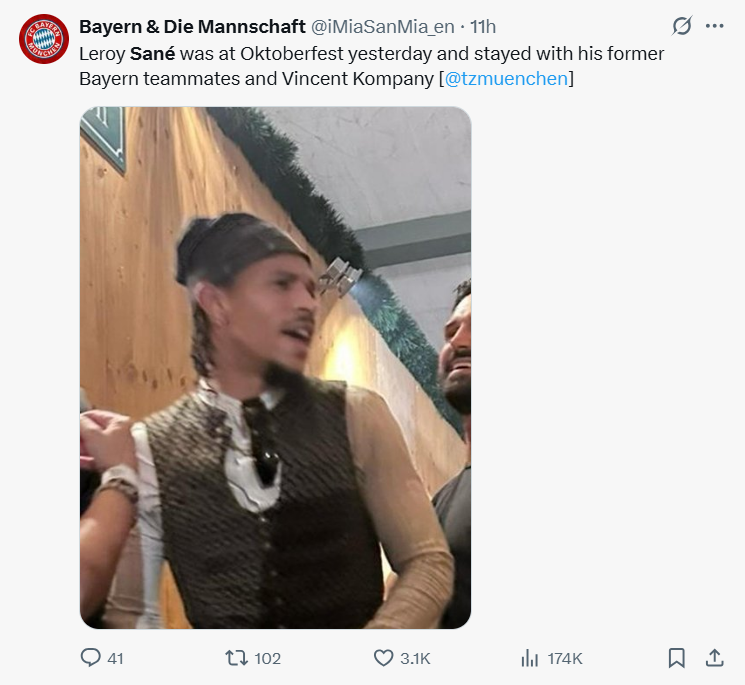 据《图片报》报道,今夏转会加盟加拉塔萨雷的萨内周末回到慕尼黑参加了啤酒节活动,但遭到慕尼黑球迷辱骂,并上演和球迷互殴的闹剧。