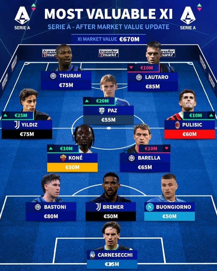 意甲最贵首发:伊尔迪兹普利西奇领衔,国米四人入选