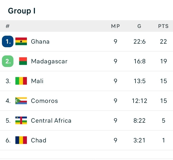 目前积分排名,加纳在9场比赛过后取得了7胜1平1负,积22分的战绩排名小组第一,领先身后第二名的马达加斯加3分差距,此外球队打入了22球丢掉6球,净胜球领先了多达16球。
