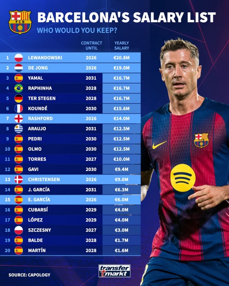 德转列巴萨队内年薪榜:莱万居首,亚马尔位居第三