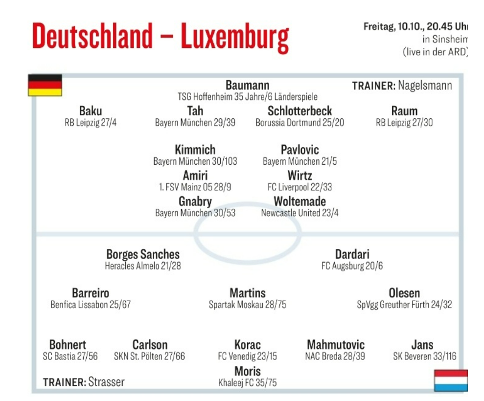 踢球者预测德国vs卢森堡首发:维尔茨领衔中场,纽卡神锋首发