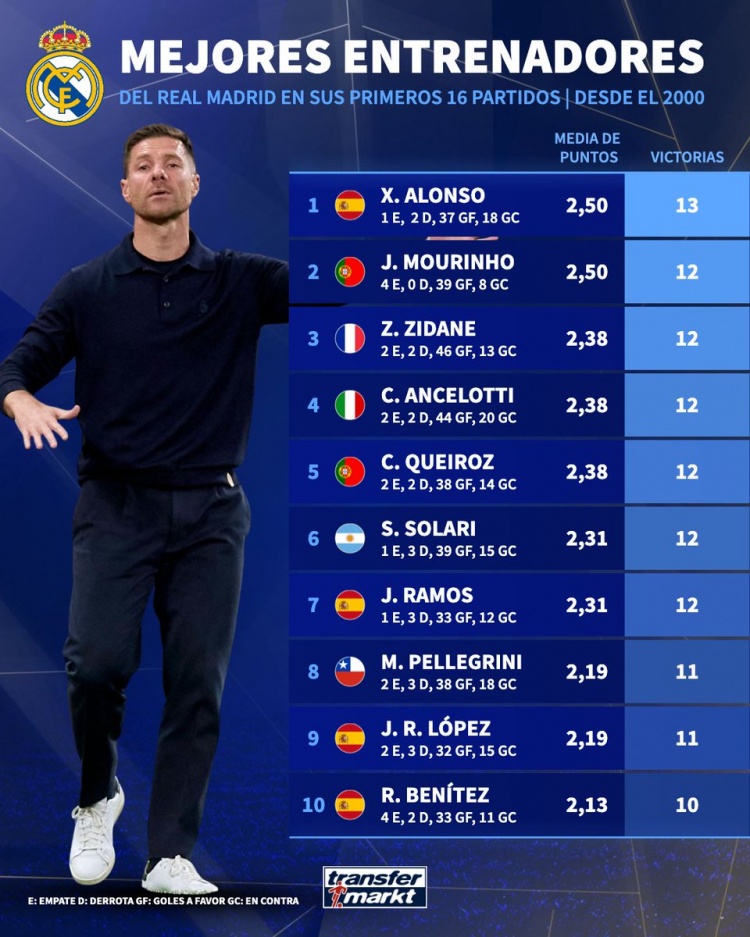 近日,德国转会市场统计出了,自2000年以来皇马主教练在执教前16场取胜场次排名,现任皇马主帅阿隆索16场拿到13胜最多,其次是穆里尼奥16场12胜。