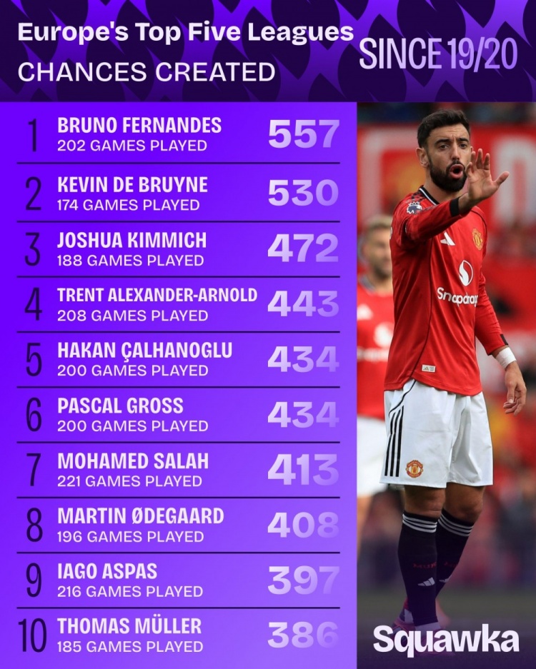近日,外媒Squawka统计了2019-20赛季至今五大联赛创造机会榜,曼联中场B费557次创造机会排名首位,领先于德布劳内的530次,基米希472次创造机会排名第三位,阿诺德、厄德高、恰尔汗奥卢等球星上榜。