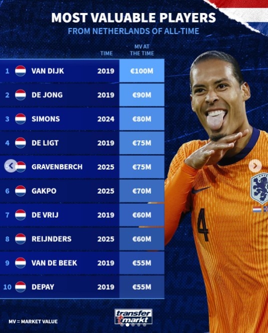 德国转会市场盘点了荷兰球员历史身价榜,其中2019年范戴克曾身价达到了1亿欧元,排名荷兰足球历史身价第一。