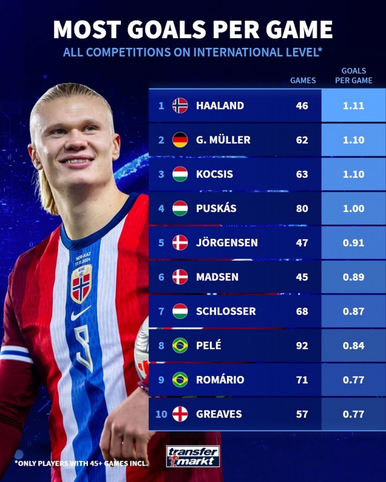 近日,德转盘点了足坛历史国家队场均进球榜,哈兰德以场均1.11球高居历史第一,他有望率领挪威队时隔27年重返世界杯。德国传奇射手盖得·穆勒场均1.10球排名第二,匈牙利双子星柯奇士与普斯卡什排名第3和第4,贝利、罗马里奥上榜。