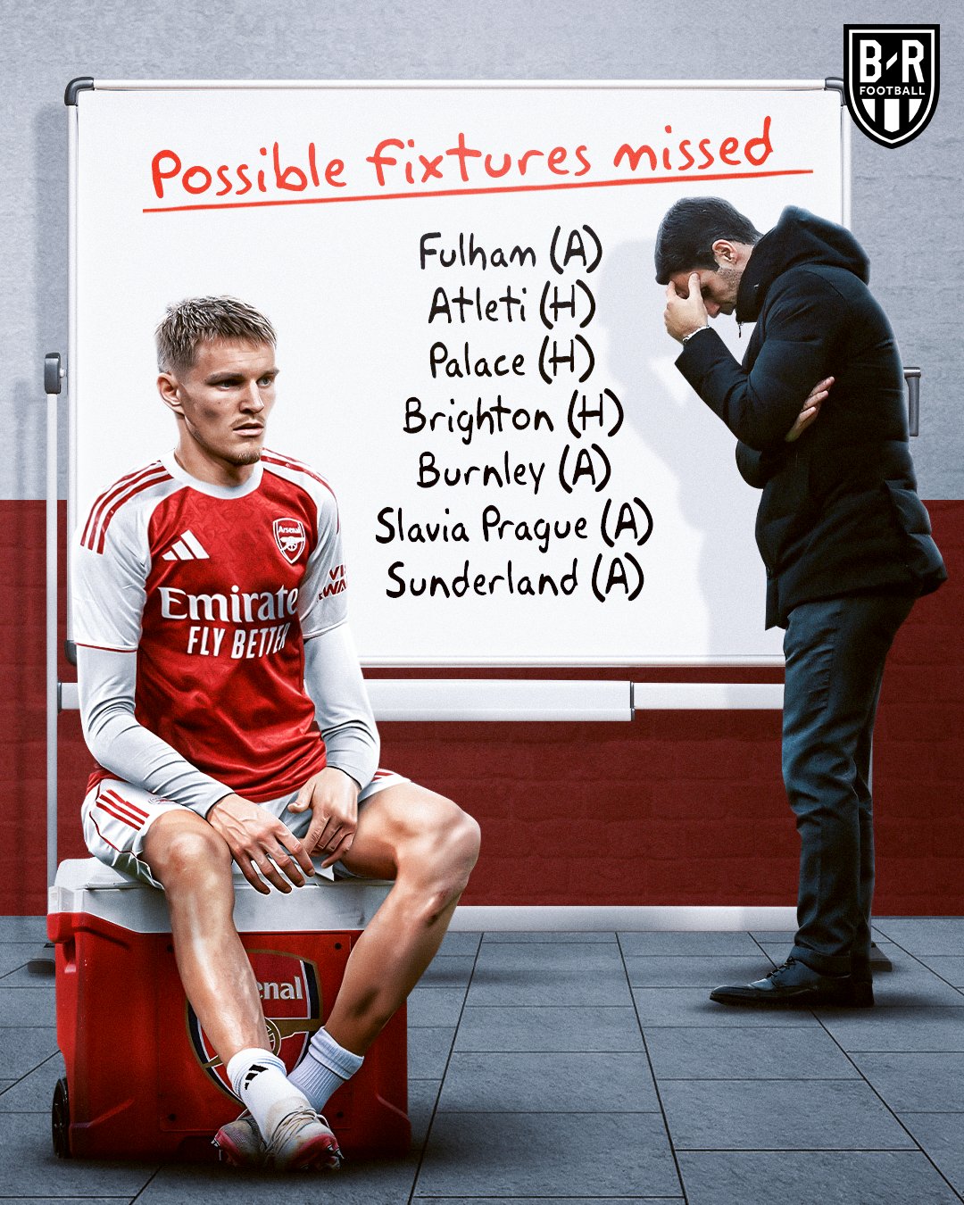 厄德高将错过7场阿森纳的比赛,球队接下来的7个对手分别是富勒姆、马竞、水晶宫、布莱顿、伯恩利、布拉格斯拉维亚、桑德兰。
