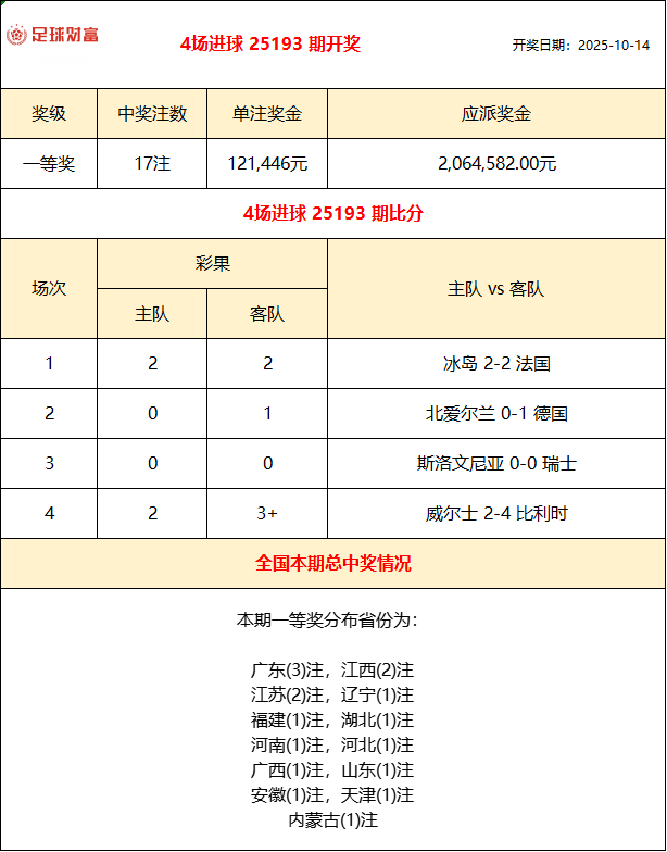 4场进球25193期开奖 :比利时4-2威尔士!头奖17注12.1万